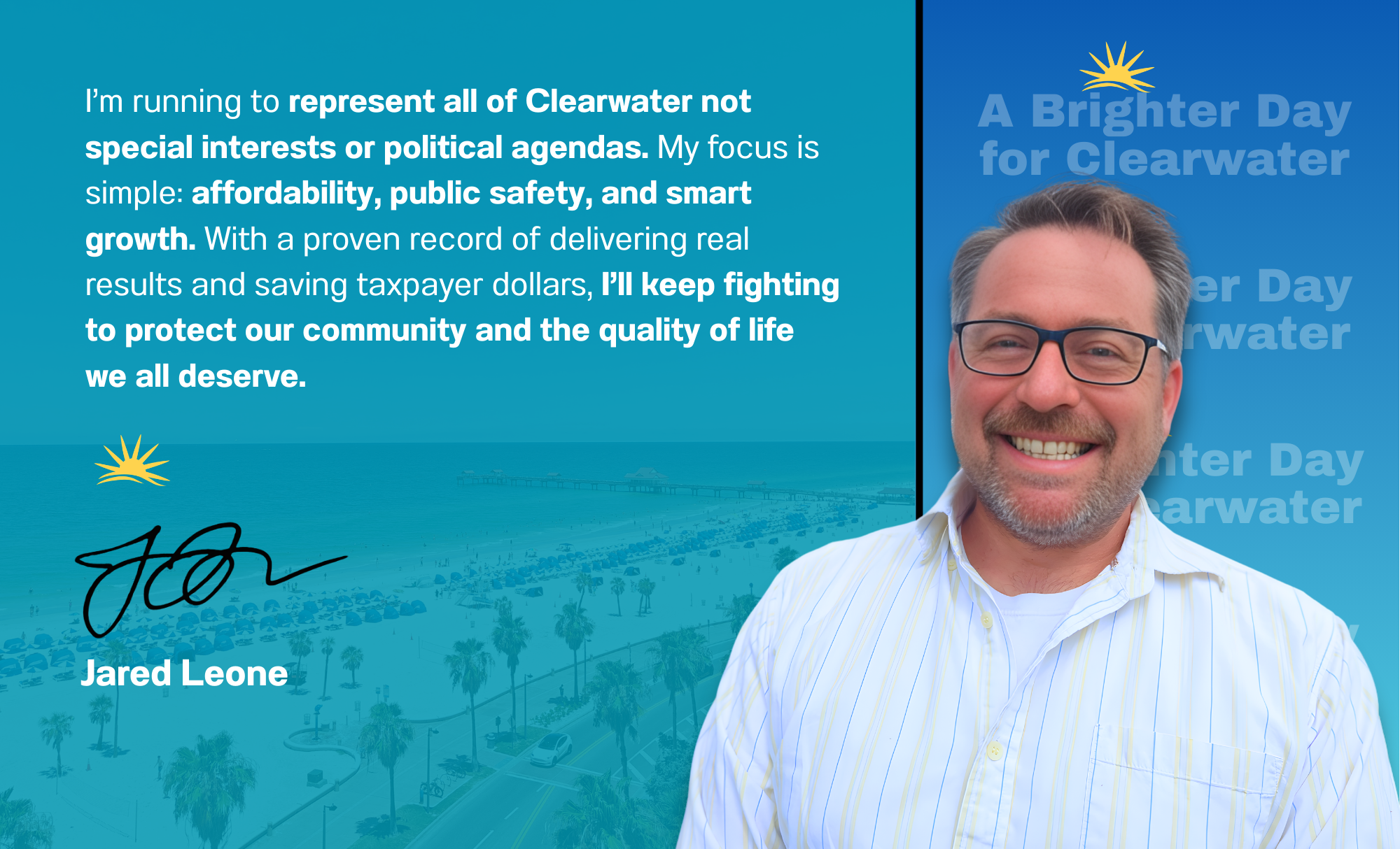 Now he is taking his commitment to the next level by running for Clearwater City Council, Seat 4. With a proven track record of service and a deep connection to the community, let’s bring a brighter day to Clearwater.